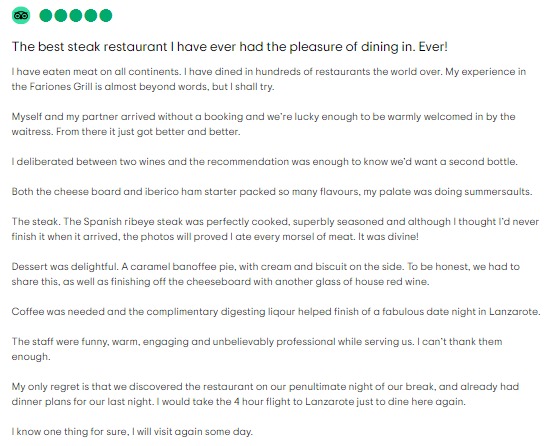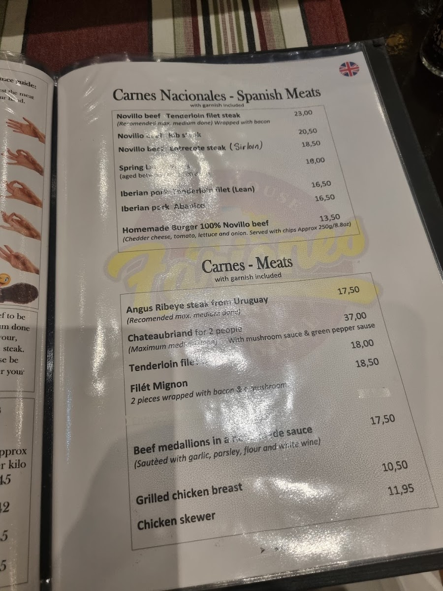 Fariones Grill - Steakhouse, Puerto del Carmen stands out as a prime destination for meat lovers seeking authentic Spanish steakhouse experience. The menu boasts expertly flame-grilled cuts, with the Chateaubriand and ribeye taking center stage, celebrated for their juiciness and perfect medium-rare preparation. Patrons can witness the butchery artistry firsthand, connecting with the craft behind every dish. Beyond steaks, options like salmon and classic Spanish sides complement the robust flavors brilliantly.